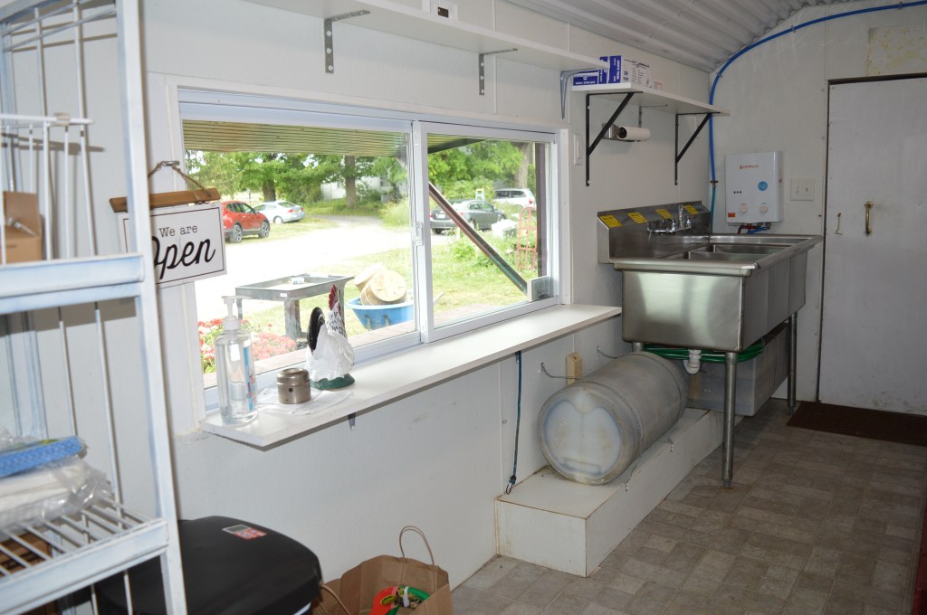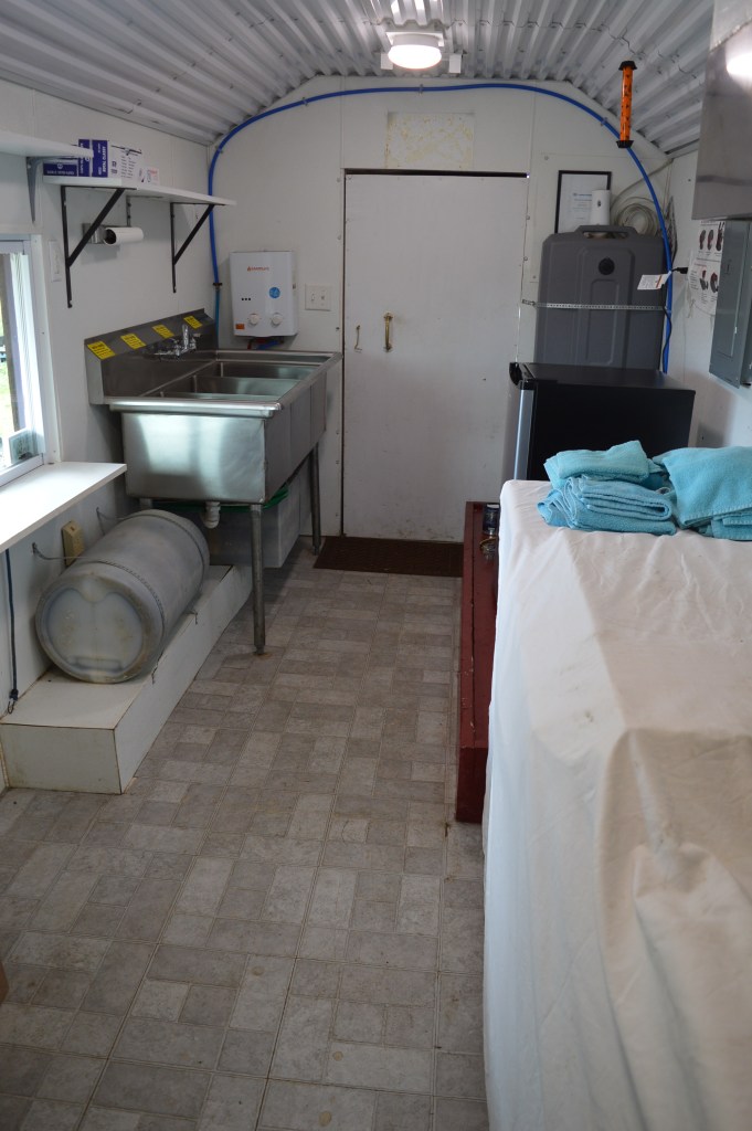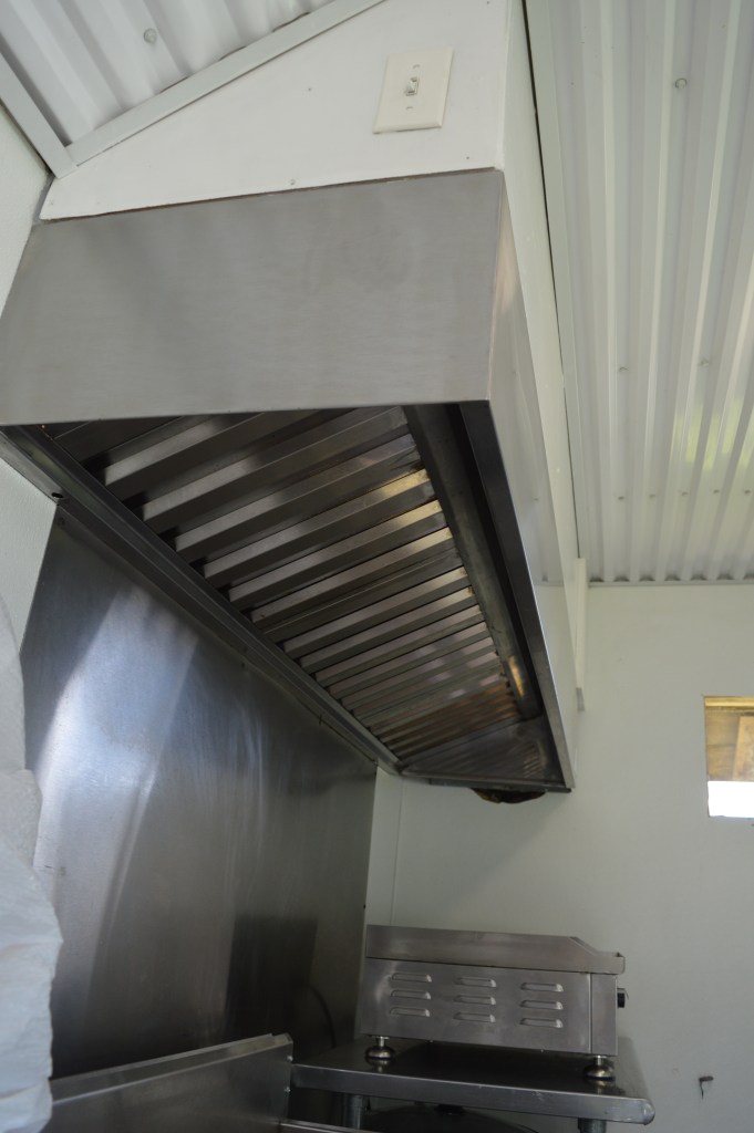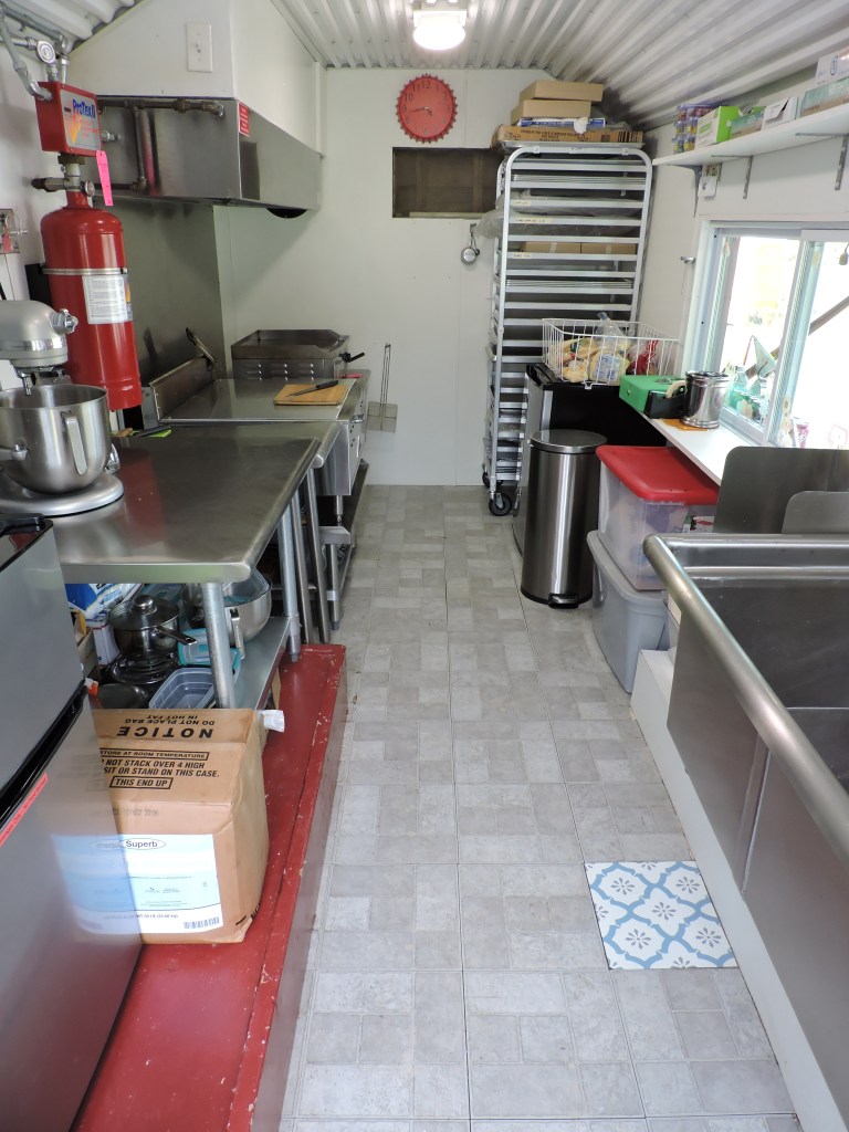 The little shack on wheels didn’t look like much from the outside, but inside it was in fine shape, equipped with a large 3-bay stainless steel sink, a commercial exhaust hood, high-capacity electric wiring to its own breaker panel, and gleaming white walls and ceiling.