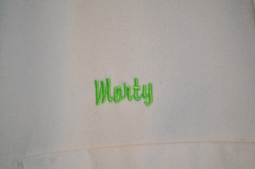 Some things just stick with me, I guess, and though it has its own name, I still refer to the Snack Shack as “Morty’s”. Each day I arrive I call out, as if The Shack and that long-gone, unknown and mysterious man of inspiration might hear me, “Good morning, Morty!”. And check out the name on my chef’s coat.