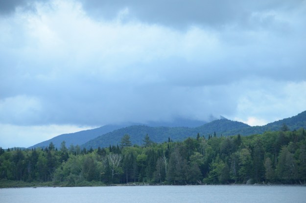 So we were lucky to find a shear pin to replace the broken one on our boat motor’s propeller, right nearby in the hamlet of Long Lake, and we leaped from the Jimmy to try to beat the thunderstorm rampaging up the lake toward us. We weren’t ten steps from the truck when the rain started. Before we entered the woods trail, the skies opened, and torrential rain fell hard. Previously, we had found the sprinkles to be quite warm. We joked that we could shower in them if we had a bar of soap.